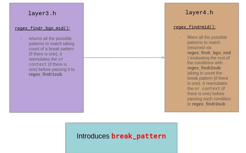 A function is in charge to match matchable patterns. The latter will take in count the break pattern. To do so, the function will have to , before evaluating a condition, look if it has an associated break pattern and if yes, cut the text until the break pattern. After that the function will evaluate on the remaining cut text. If it is a success, then the remaining part of the text will be added to the cut part.